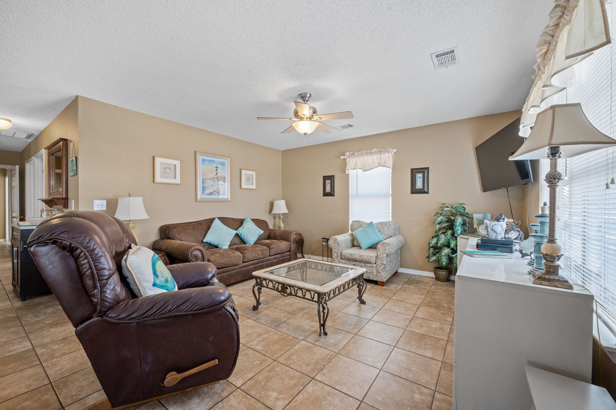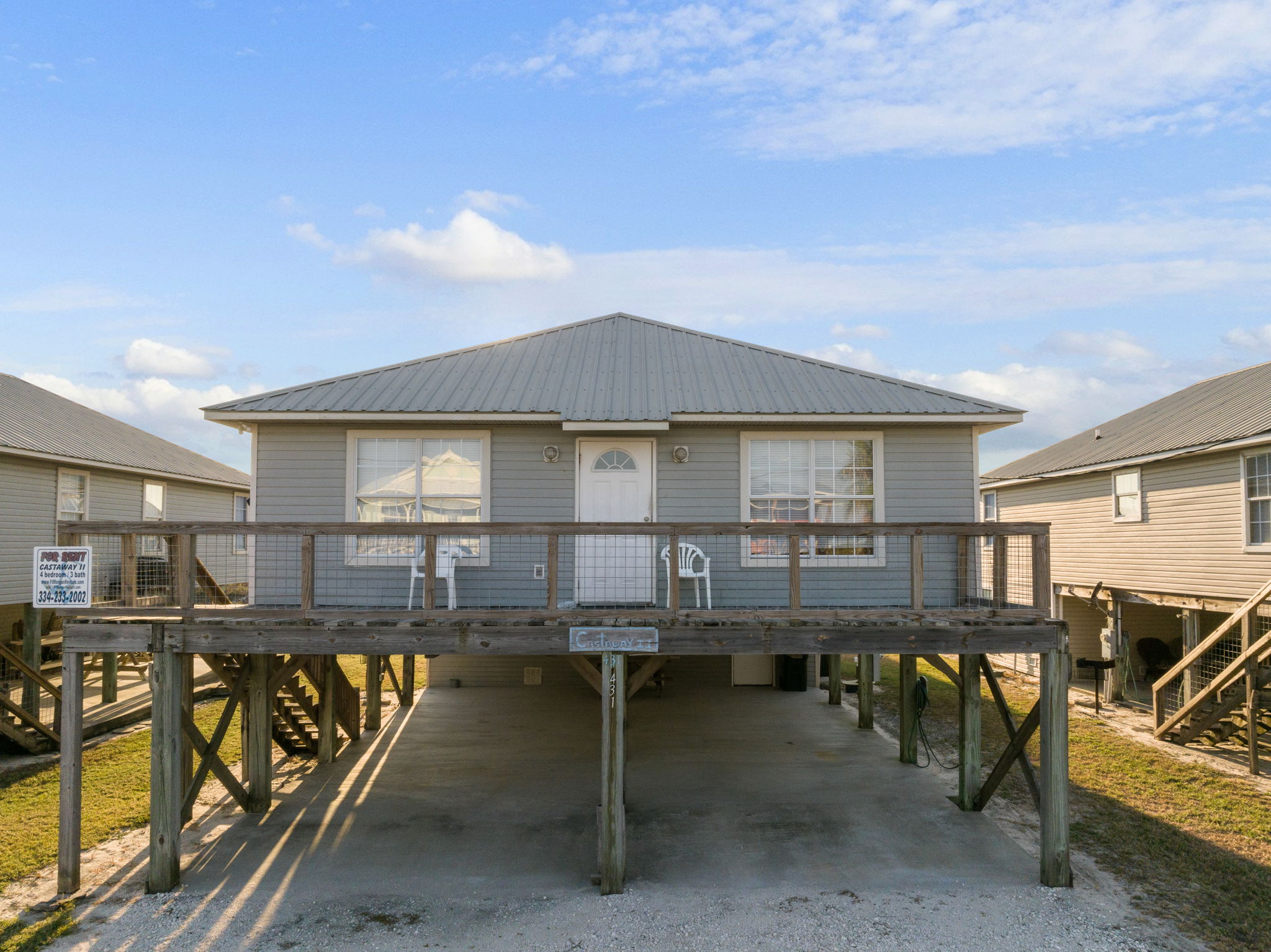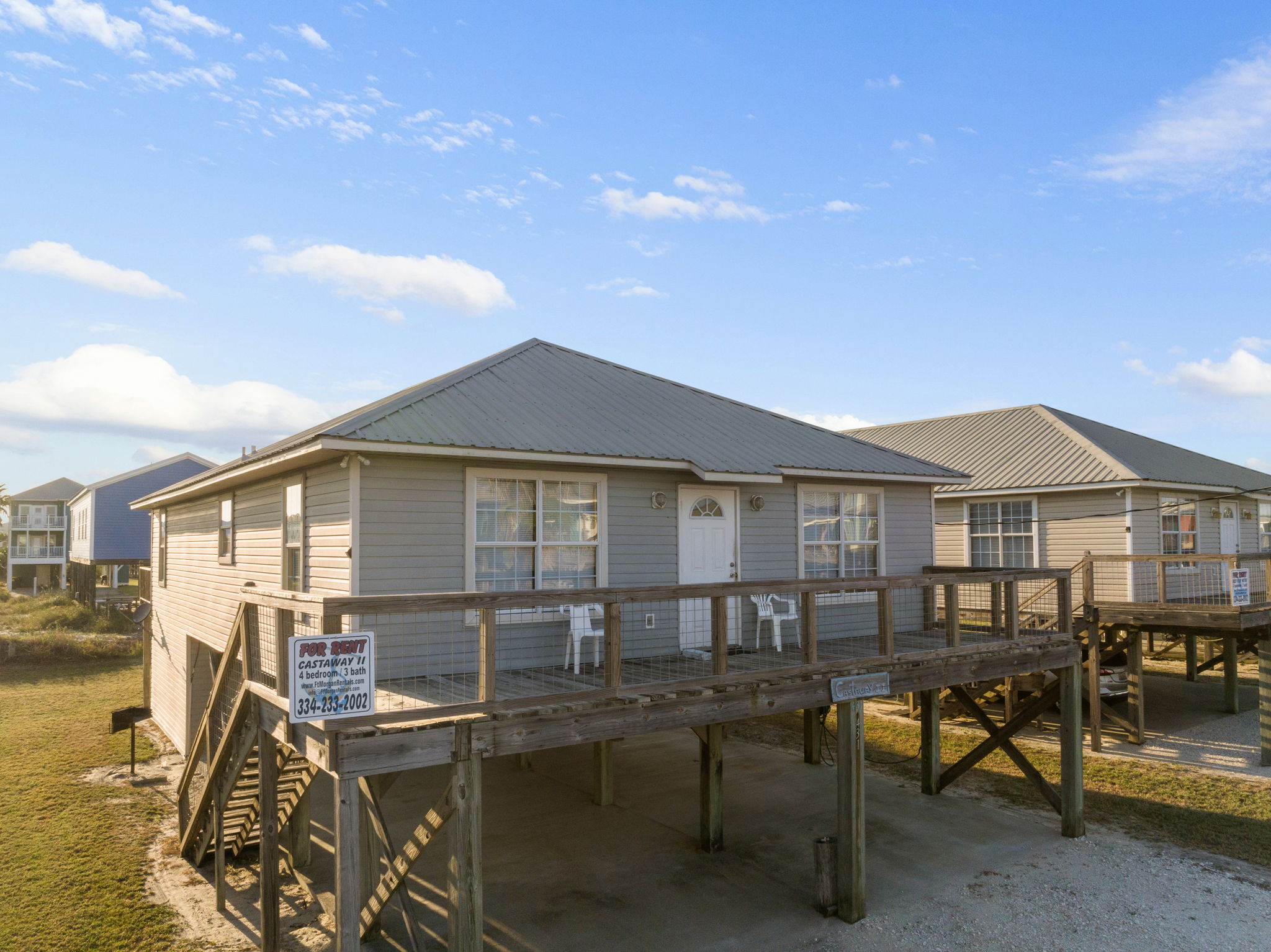 Castaway II was built in the summer of 2001, and was renovated in the spring of 2009 with tile flooring (except bedrooms) and painted throughout its interior. It is a fully furnished four (4) bedroom, three (3) bath home, with everything you will need for a quiet and restful vacation in our "no condo" single family residential community of Fort Morgan. All linens, utensils, dishwasher, microwave, and washer and dryer are present for your use; TVs in the family room and master bedroom with satellite for your enjoyment, along with DVD and VCR players.