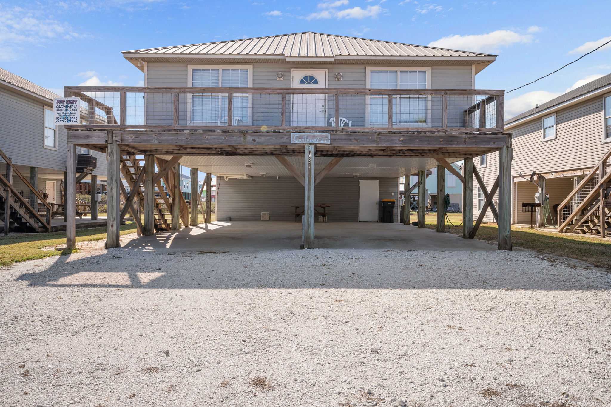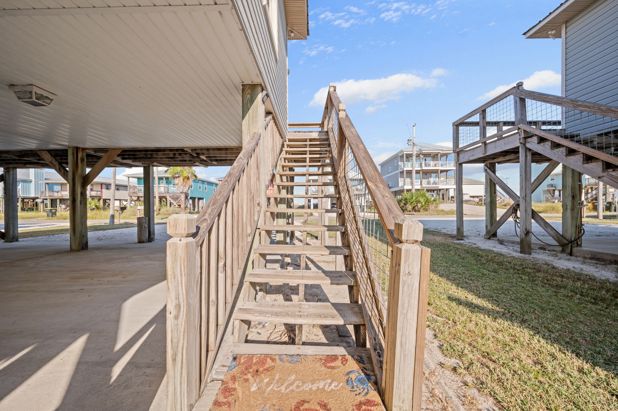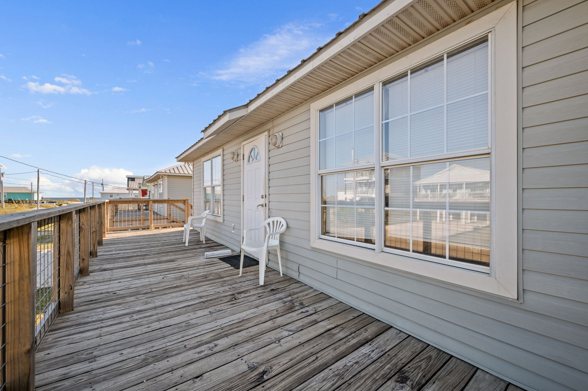 The front deck faces east- perfect for enjoying a Gulf coast sunrise, and is shaded in the afternoon for enjoying the view of the Gulf and the constant Gulf breezes. This house is located approximately 300 feet (length of a football field) from the Gulf- our street (Bernard Court East) dead-ends on the beach- there is no cutting through other folk’s property, or walking great distances to gain public beach access.